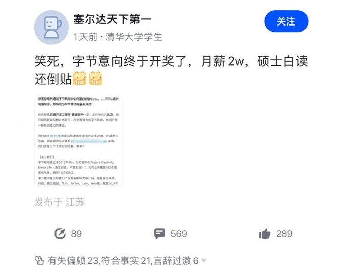 当然当事人是清华硕士,应聘的是技术含量相对较高的后端开发岗,加上字节跳动的公司招牌,以及和其他公司类似岗位的横向比较,所以会有比较高的期望值。